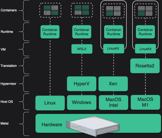 Containers are built on 'cgroups' (control groups), which are a feature of the Linux kernel that limits monitors, and isolates the resource usage of a collection of processes. This means that running containers on Linux is very lightweight form of virtualisation. However, on other operating systems which do not use the Linux kernel, a Linux virtual machine or translation-layer must be created to run containers. The manner by which each Operating System resolves this issue varies greatly as shown below. Because of this variance, the self-hosting documentation targets Linux as a means of avoiding excess complexity.