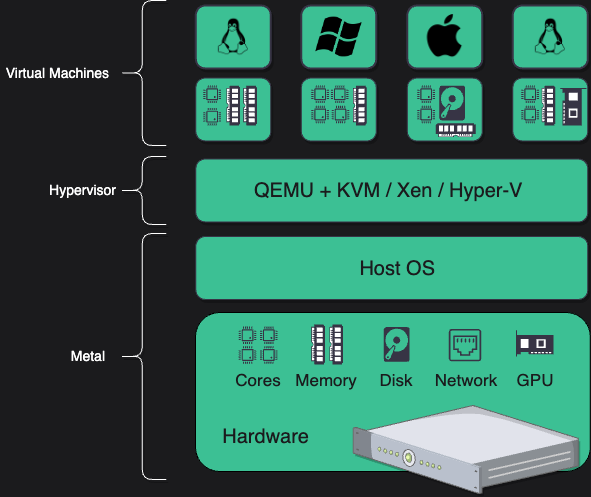 Virtual Machines are a software-defined layer of abstraction atop a Bare-Metal host which makes deployments more consistent and easier to manage declaratively. This greatly reduces the difficulty of re-deployment and creates the conditions required for securely running multiple guests within the same physical host. Virtual Machines can also be used to create hosts that run different operating systems (Windows, MacOS) or architectures (ARM) than the host machine. This added functionality comes at the cost of added complexity, a slight performance penalty, and you need to already have a Bare-Metal host on which to run the VMs.