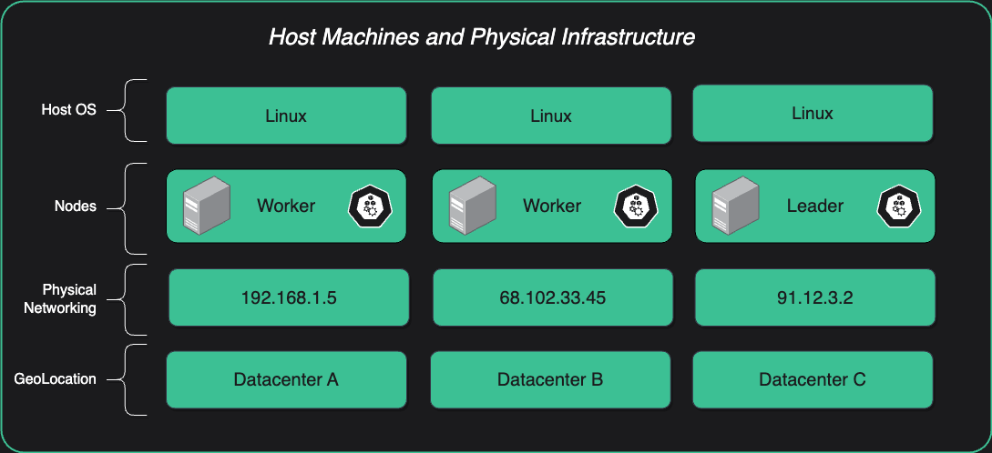 Kubernetes is somewhat of a combination of all other host types. Since it is an API, it must be installed on an existing host (called a "Node") which is usually either a VM or physical device. A Kubernetes "Cluster" is usually made up of 3 or more nodes - though you can have as few as one, or as many 5,000 per cluster.