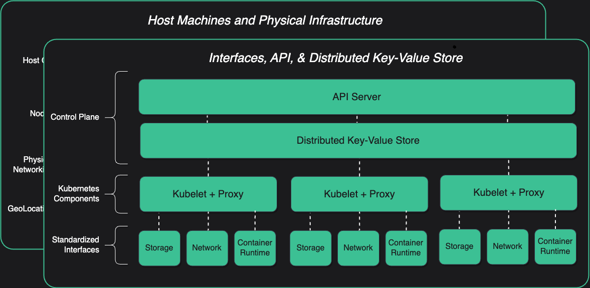 Once installed, Kubernetes creates standardised interfaces to control the hardware & software components of the underlying nodes (networking, storage, GPUs, CPU cores etc...) as well as a distributed key-value store which facilitates communication between all nodes in the cluster.