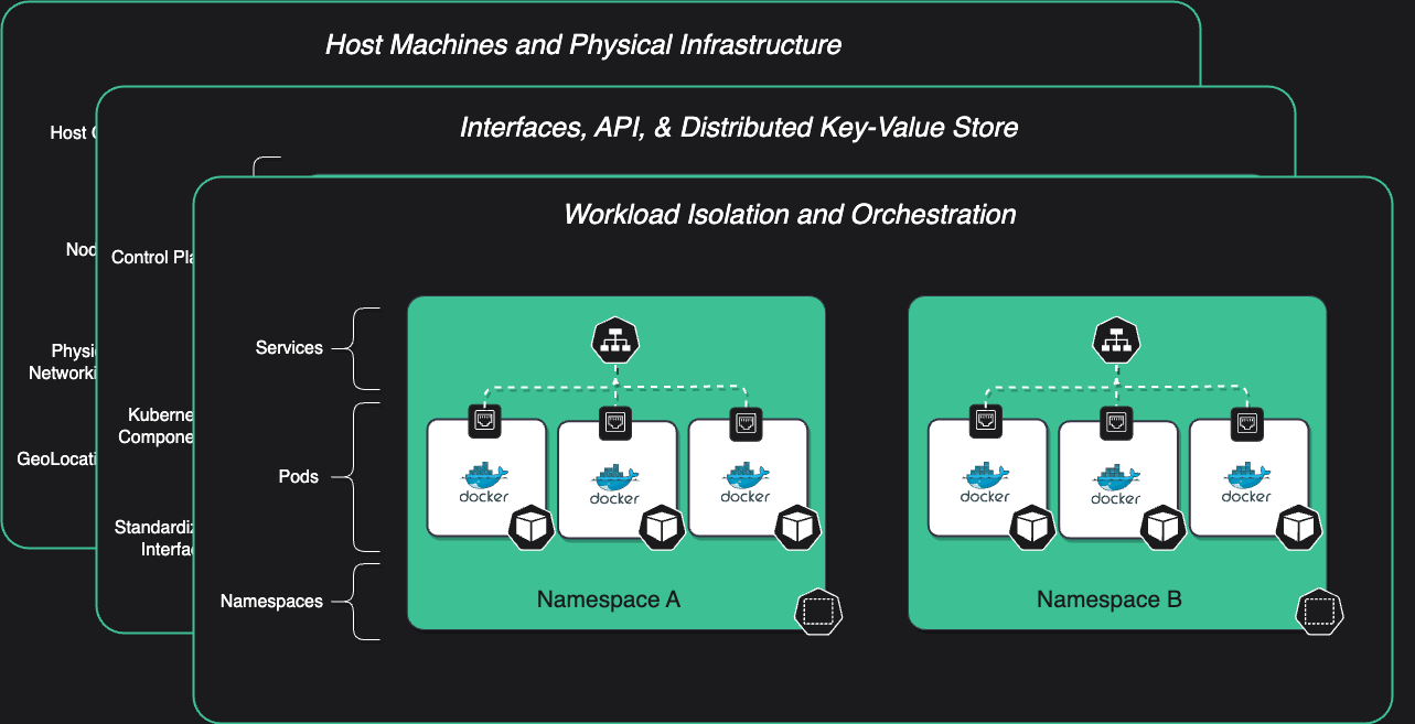 With the underlying hardware abstracted into a generic pool of resources, Kubernetes is then able to re-compose those assets into isolated environments called "Namespaces" where it deploys containerised workloads in groups called "Pods". This layer of Kubernetes is very similar to a typical container host but with many more features for multi-tenancy, security, and life-cycle management.
